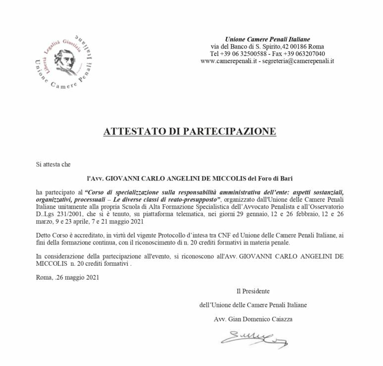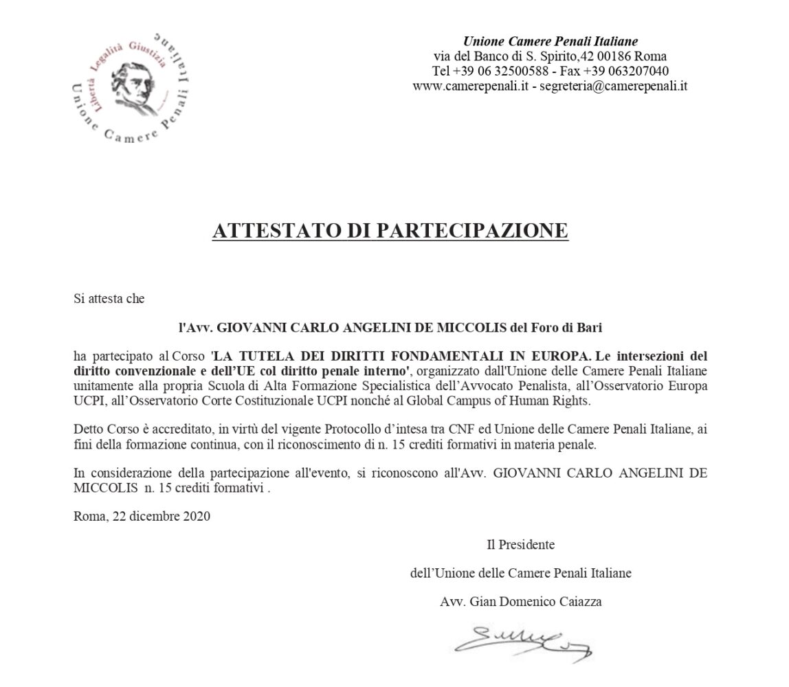 L’Avvocato Angelini De Miccolis partecipa a percorsi formativi rivolti agli avvocati penalisti, organizzati dalla Camera Penale di Bari e dall’Ordine degli Avvocati di Bari, fornendo ai partecipanti competenze specialistiche e aggiornate.